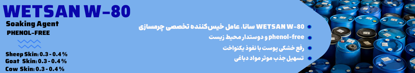 WETSAN W-80 خیسکننده تخصصی دباغی شرکت سانا (SANA) برای چرمسازان حرفهای WESTAN W-80 ، خیسکننده دباغی (Wetting agent / Soaking agent) از شرکت سانا (SANA)، راهکاری حرفهای و دوستدار محیط زیست برای کارخانههای چرمسازی است که به دنبال رفع خشکی پوست و آمادهسازی یکنواخت برای مراحل بعدی دباغی هستند. این محصول با عملکرد کنترلشده، نفوذ یکنواخت مواد را تسهیل کرده و کیفیت نهایی چرم را بهبود میبخشد. همین حالا با …