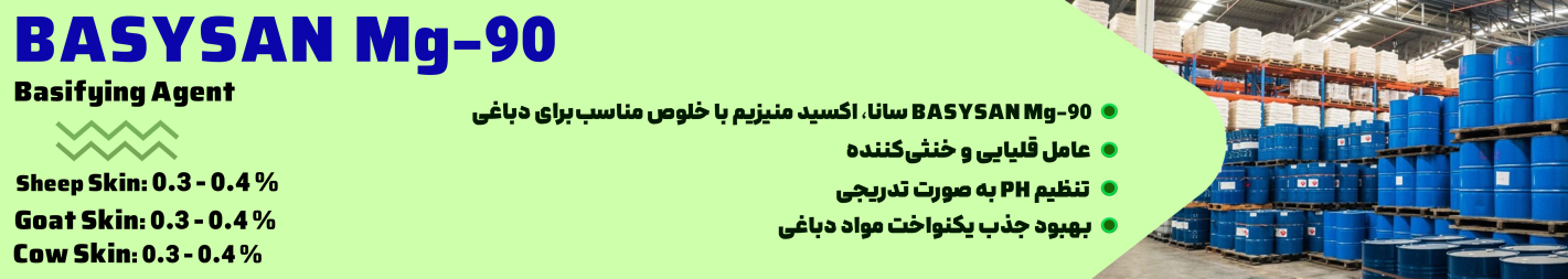 BASYSAN Mg-90 اکسید منیزیوم تخصصی دباغی شرکت سانا (SANA) برای چرمسازان حرفهای BASYSAN Mg-90 ، اکسید منیزیوم دباغی (Basifying agent / خنثی کننده دباغی) از شرکت سانا (SANA)، راهکاری حرفهای و عملی برای کارخانههای چرمسازی است که به دنبال تنظیم دقیق pH، بهبود جذب مواد و افزایش کیفیت نهایی چرم هستند. این محصول با عملکرد کنترلشده، فرآیند خنثیسازی را بهینه کرده و کیفیت نهایی چرم را تضمین میکند. همین حالا با …