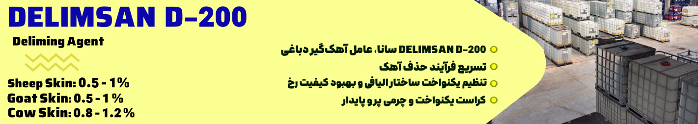 DELIMSAN D-200 آهکگیر تخصصی دباغی شرکت سانا (SANA) برای چرمسازان حرفهای DELIMSAN D-200 ، آهکگیر دباغی (DeLiming agent) از شرکت سانا (SANA)، راهکاری حرفهای و عملی برای کارخانههای چرمسازی است که به دنبال افزایش سرعت آهکگیری، بهبود رخ چرم و تولید چرمی یکنواخت و پر هستند. این محصول با عملکرد دقیق، فرآیند آهکگیری را بهینه کرده و کیفیت نهایی چرم را تضمین میکند. همین حالا با کارشناسان سانا تماس …